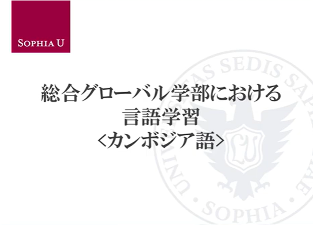 上智大学とカンボジアの繋がりは長く深く、直接的には1979年12月に始まったソフィア・ミッション「インドシナ難民に愛の手を」及びその後の難民キャンプへの支援活動を端緒としています(もっと昔に遡るならば、16世紀頃イエズス会の宣教師たちがカンボジアへ派遣されたことが記録に残っています)。以来上智大学は教職員と学生が、社会奉仕活動を通じてカンボジアの人々と深く関わってきました。本学が提供しているカンボジアに関わる多様な講義科目は、相手の歴史や文化への理解を踏まえて現地での実践的活動に繋げてもらいたいという希望が前提にあります。語学科目としてのカンボジア語(初級、中級)もこのような意図のもとで開設されました。カンボジア語を通じて、あなたもソフィア・ミッションの扉の向こうへ行ってみませんか。