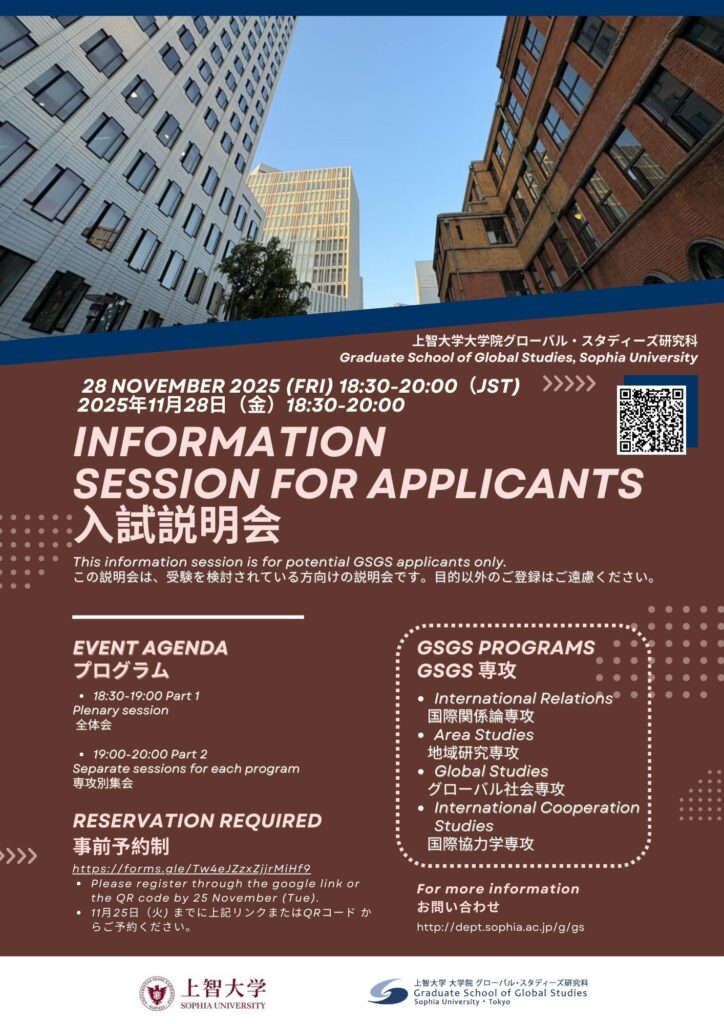 For those interested in applying for the Graduate School of Global Studies, this is a great opportunity to discuss your field of research and interests with the professors. We are looking forward to meeting you. For details regarding admission procedures (such as requirements and necessary documents) please refer to Sophia University website or contact the admission office.