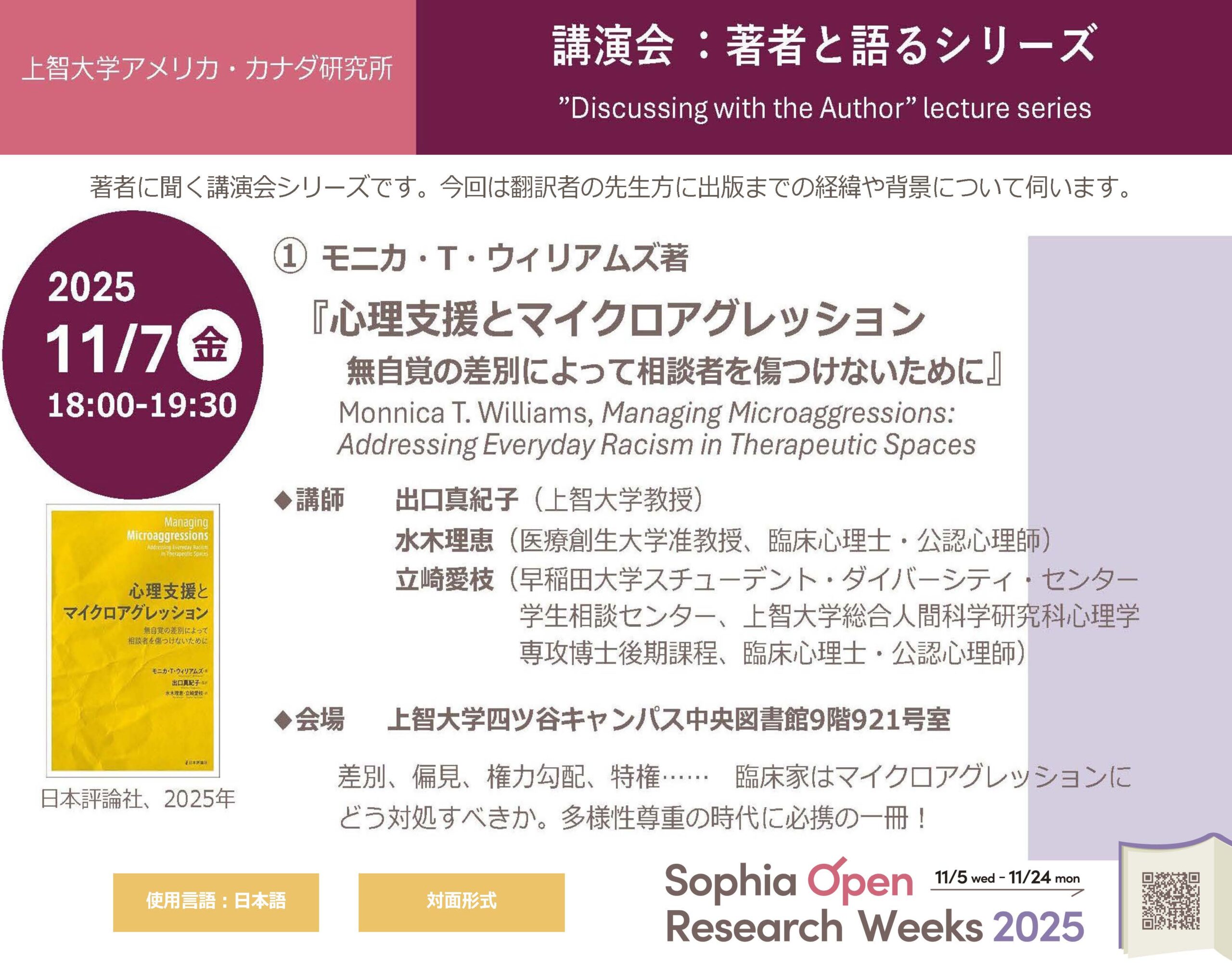 今回は『心理支援とマイクロアグレッション:無自覚の差別によって相談者を傷つけないために』日本評論社、2025年(原著:Monnica T. Williams, Managing Microaggressions: Addressing Everyday Racism in Therapeutic Spaces)を取り上げて、翻訳された先生方に本の成り立ちや著作の背景などをお話しいただきます。是非多くの皆様のご参加をお待ち致しております。 |