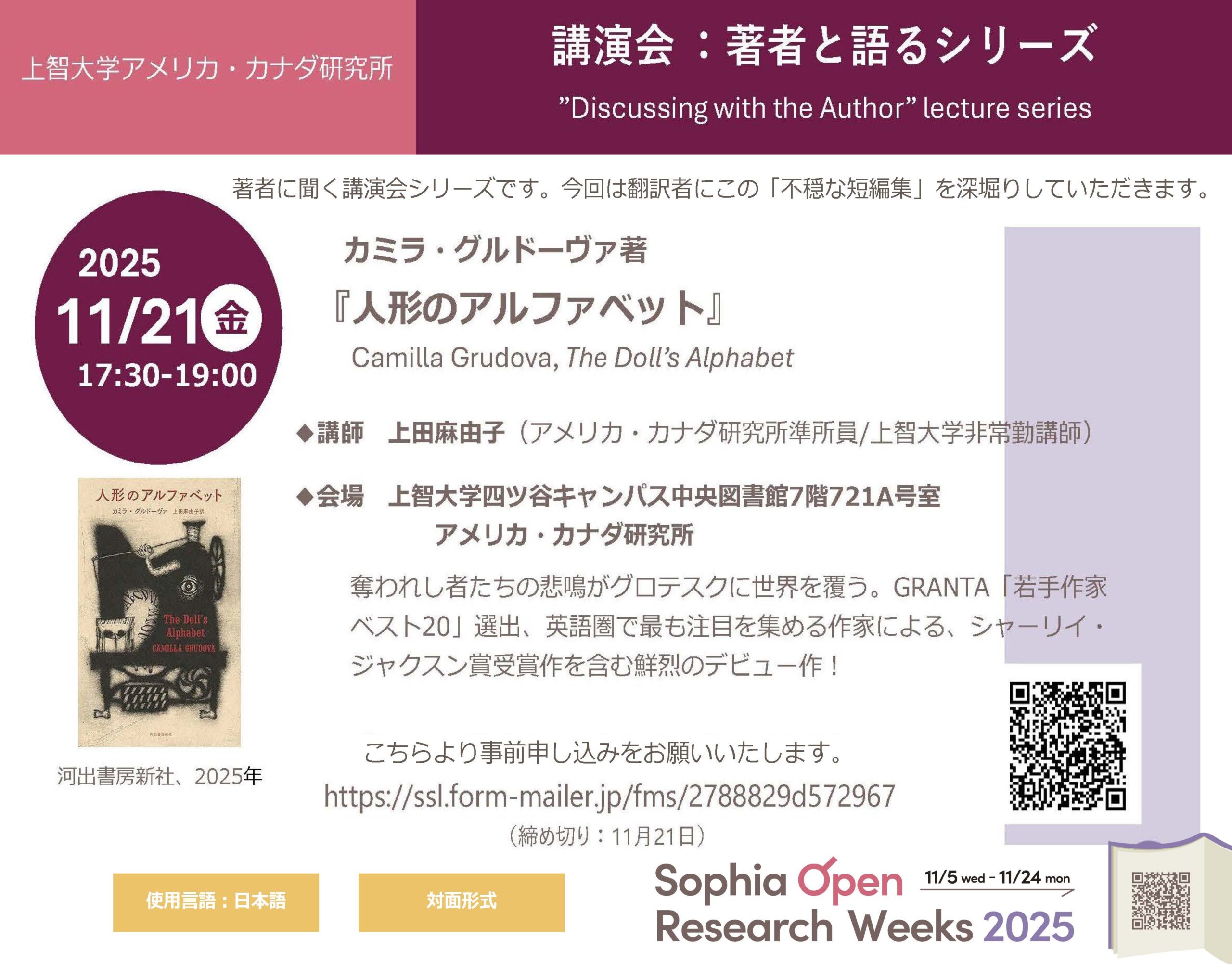 申込み 今回は『人形のアルファベット』河出書房新社、2025年(原著:Camilla Grudova, The Doll’s Alphabet)を取り上げて、本の成り立ちや翻訳の背景などをお話しいただきます。