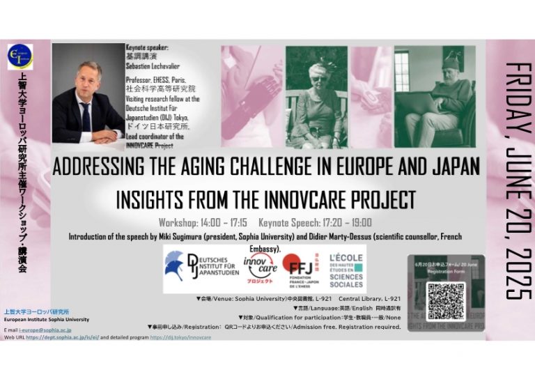 Additional information | The European Institute of Sophia University, in conjunction with the German Institute for Japanese Studies (DIJ Tokyo) and the EHESS (Ecole des Hautes Etudes en Sciences Sociales), is organizing a workshop on the aging challenge in Japan and Europe. The afternoon part of the workshop is open to students, faculty and staff members, and the general public. The day will be concluded by a keynote speech translated into Japanese. Detailed program: https://www.dijtokyo.org/wp-content/uploads/2025/06/Program-20-June-2025-final.pdf |