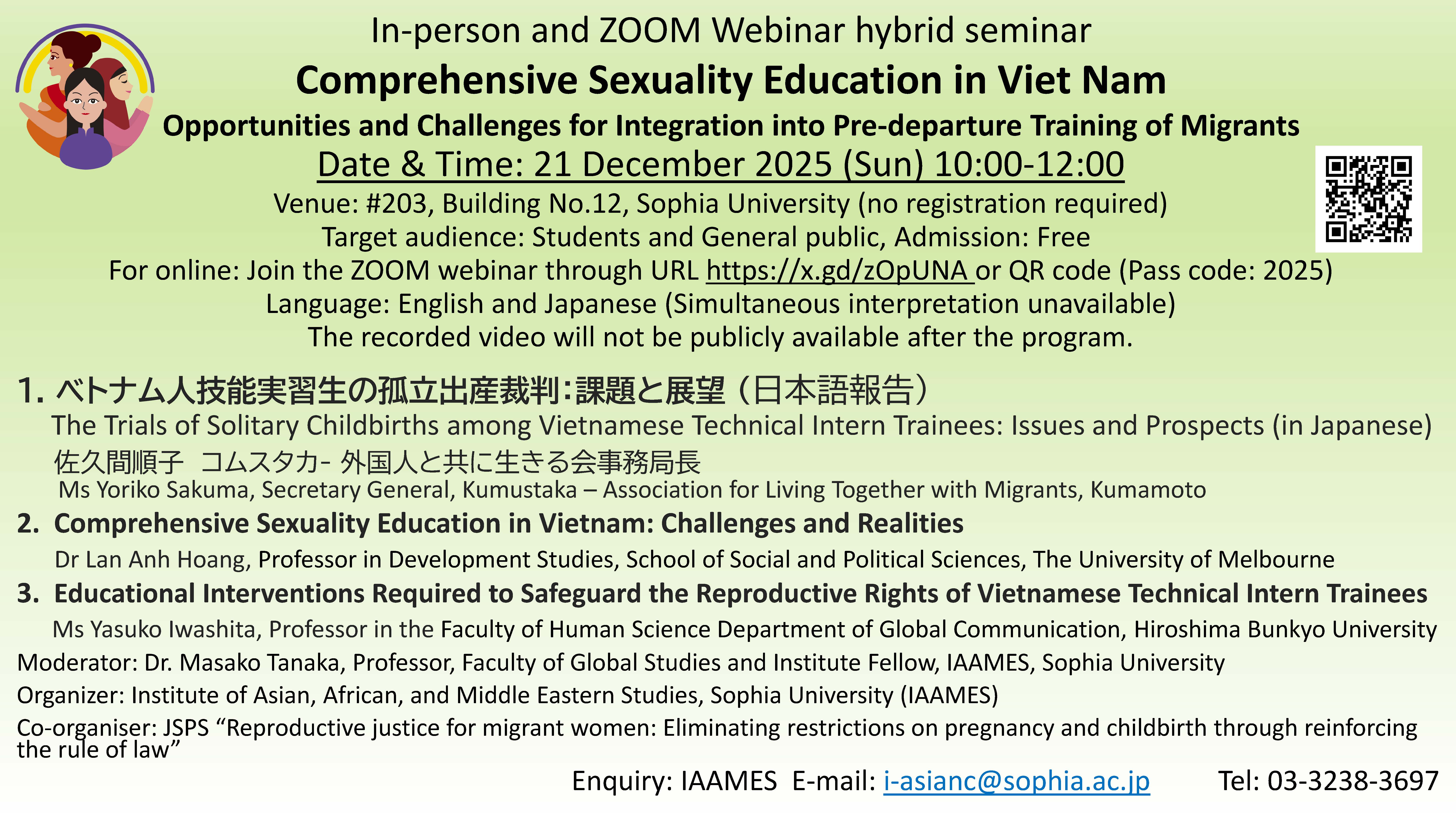 Co-organizer: JSPS Reproductive justice for migrant women: Eliminating restrictions on pregnancy and childbirth through reinforcing the rule of law | | Date and time | Sunday, December 21, 2025