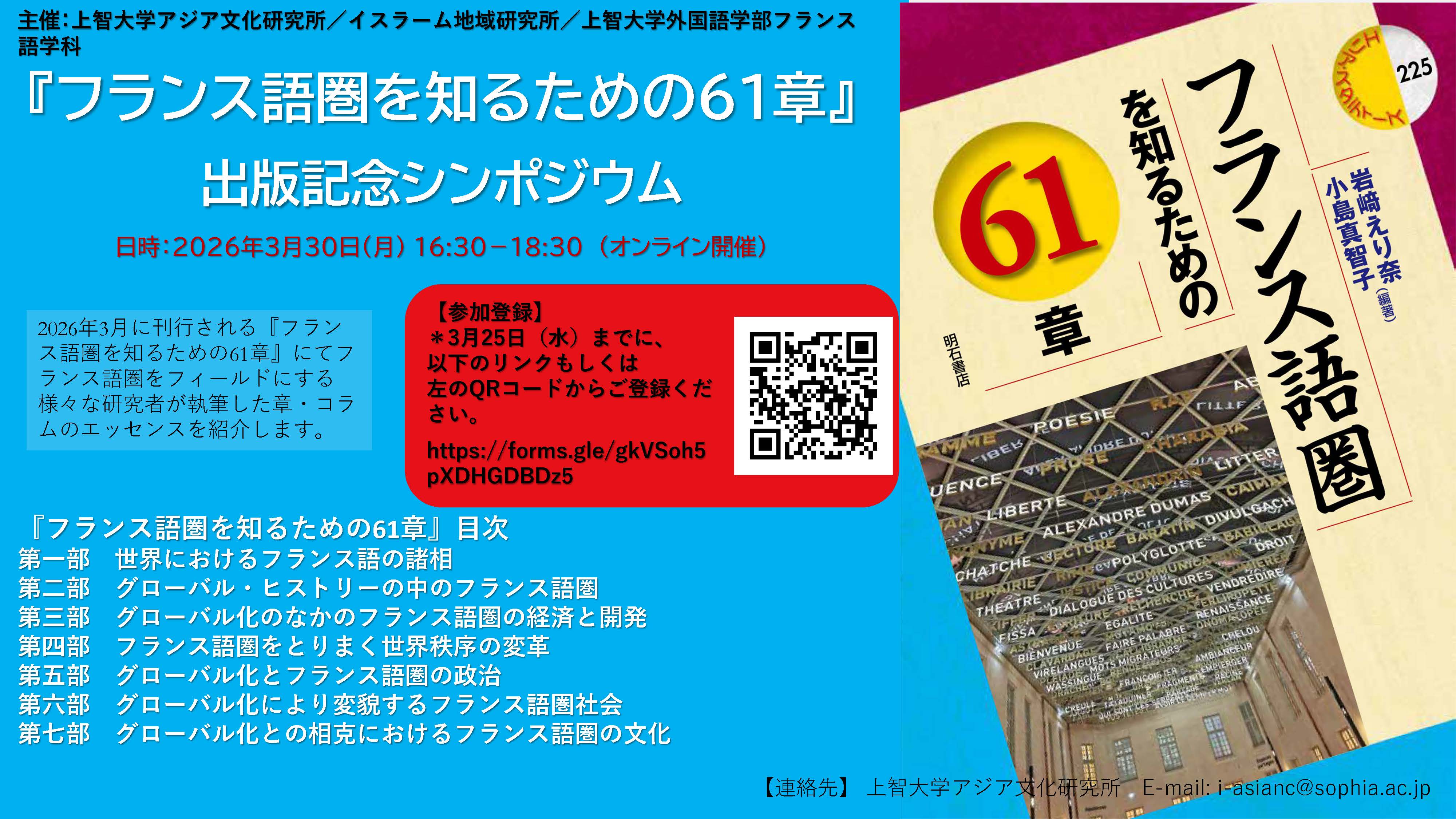 2026年03月05日 16:36:25 『フランス語圏を知るための61章』出版記念シンポジウム(オンライン)を2026年3月30日(月)に開催いたします。
