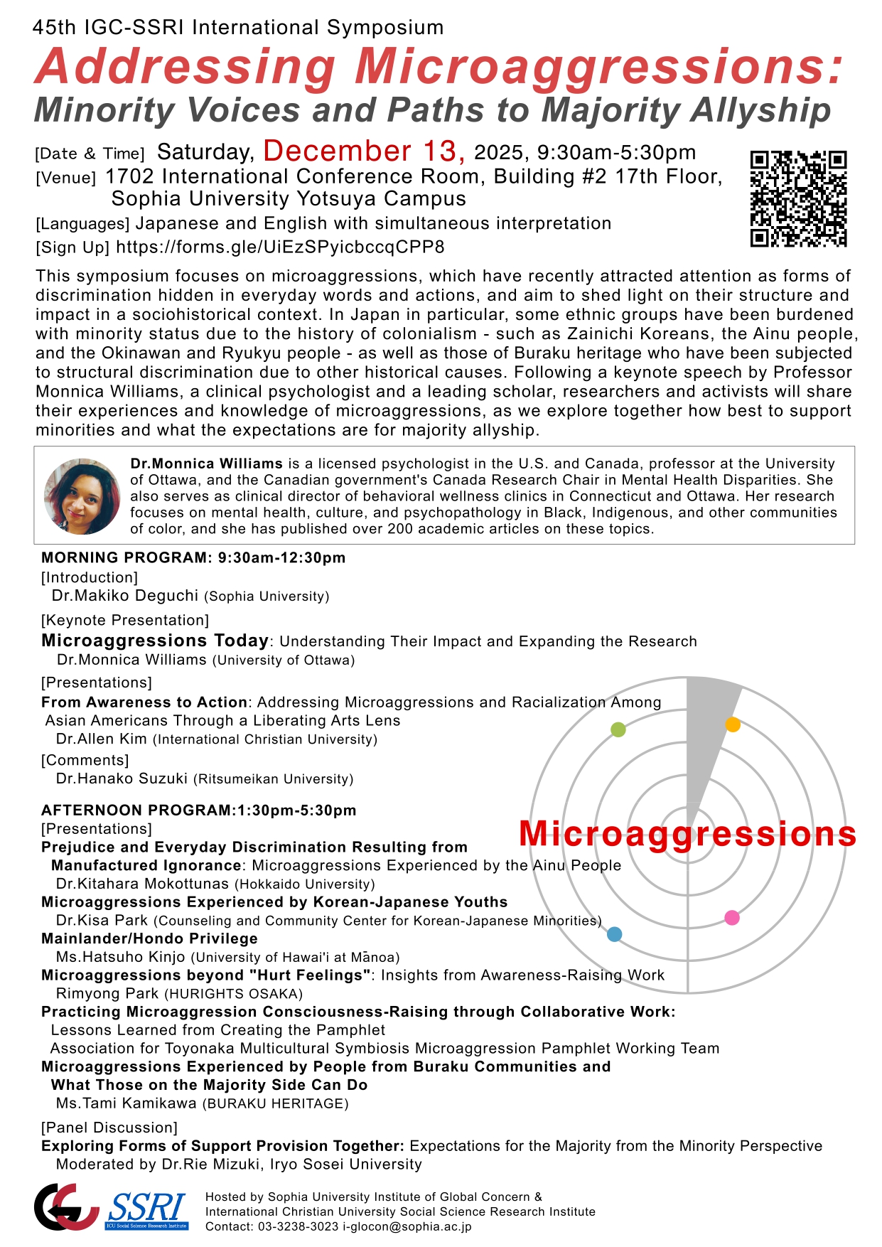 This symposium focuses on microaggressions, which have recently attracted attention as forms of discrimination hidden in everyday words and actions, and aim to shed light on their structure and impact in a sociohistorical context. In Japan in particular, some ethnic groups have been burdened with minority status due to the history of colonialism – such as Zainichi Koreans, the Ainu people, and the Okinawan and Ryukyu people – as well as those of Buraku heritage who have been subjected to structural discrimination due to other historical causes. Following a keynote speech by Professor Monnica Williams, a clinical psychologist and a leading scholar, researchers and activists will share their experiences and knowledge of microaggressions, as we explore together how best to support minorities and what the expectations are for majority allyship.