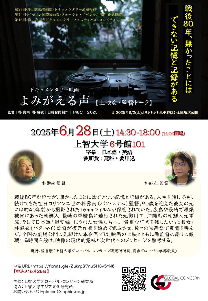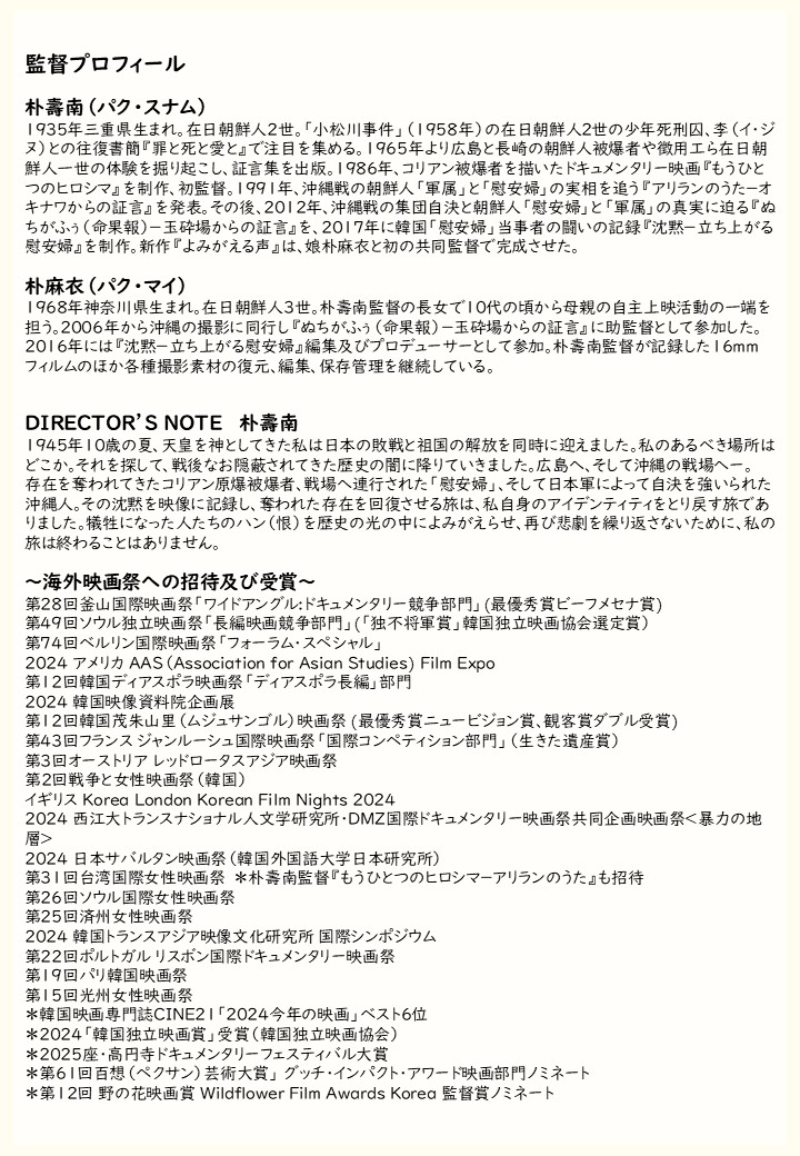 戦後80年が経つが、無かったことにはできない記憶と記録がある。人生を賭して撮り続けてきた在日コリアン二世の朴壽南(パク・スナム)監督。90歳を迎えた彼女の元には約40年前から撮影された16mmフィルムが保管されていた。広島や長崎で原爆被害にあった朝鮮人、長崎の軍艦島に連行された元徴用工、沖縄戦の朝鮮人元軍属、そして日本軍「慰安婦」にされた女性たち…。「貴重な証言を残したい」と長女・朴麻衣(パク・マイ)監督が復元作業を始めて完成させ、数々の映画祭で反響を呼んだ。全国の劇場公開に先駆けた本企画では、映画の上映とともに両監督の語りに傾聴する時間を設け、映像の現代的意味と次世代へのメッセージを熟考する。