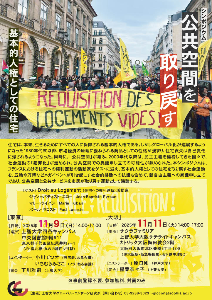 住宅は、本来、生きるためにすべての人に保障される基本的人権です。1980年代末以降の新自由主義的なグローバリゼーションにともない、市場経済の原理に委ねられる商品としての性格が強まり、住宅喪失は自己責任に帰されるようになりました。同時に、「公共空間」が縮み、2000年代以降、民主主義を標榜してきた国々で、社会運動が「犯罪化」され、公共空間での異議申し立ての可能性が狭められてきました。本シンポジウムは、フランスにおける住宅への権利運動の活動家をゲストに迎え、基本的人権としての住宅を取り戻す社会運動を、五輪や万博などメガイベントが引き起こす社会的排除への抗議も含めて、新自由主義への異議申し立てであり、公共空間と公共サービスを市民が取り戻す運動として議論します。