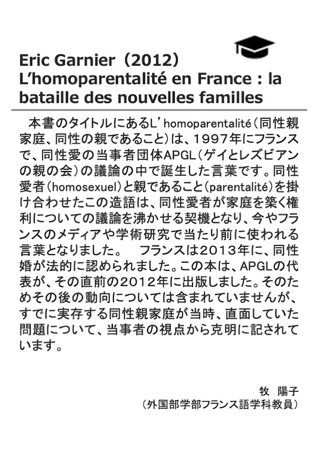 | フランスの同性婚と親子関係ーージェンダー平等と結婚・家族の変容 | イレーヌ・テリー, 石田久仁子, 井上たか子訳 | 明石書店 | 2019 | ||