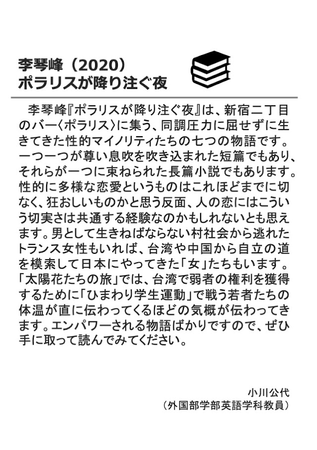 | ポラリスが降り注ぐ夜 | 李琴峰 | 筑摩書房 | 2020 | ||