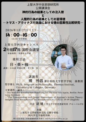 【公開講演会】 神的行為の結果としての注入徳と、人間的行為の結果としての習得徳 ― トマス・アクィナス行為論における徳の因果性比較研究 ―