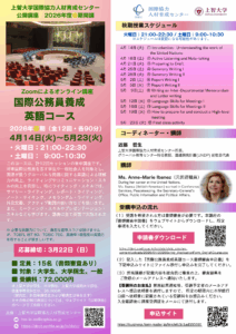 2026年4月14日(火)より上智大学国際協力人材育成センター主催の公開講座「国際公務員養成英語コース」をオンライン(Zoom)にて開講します。