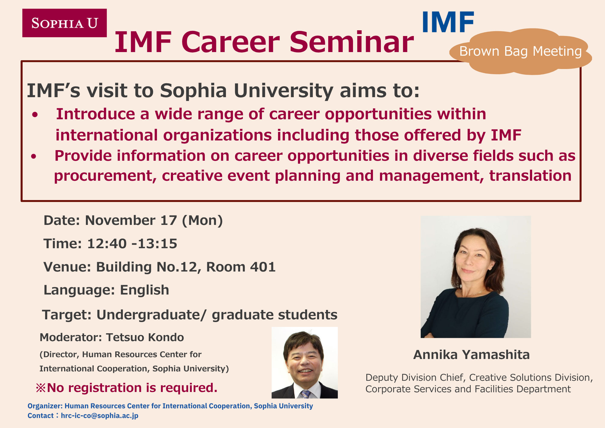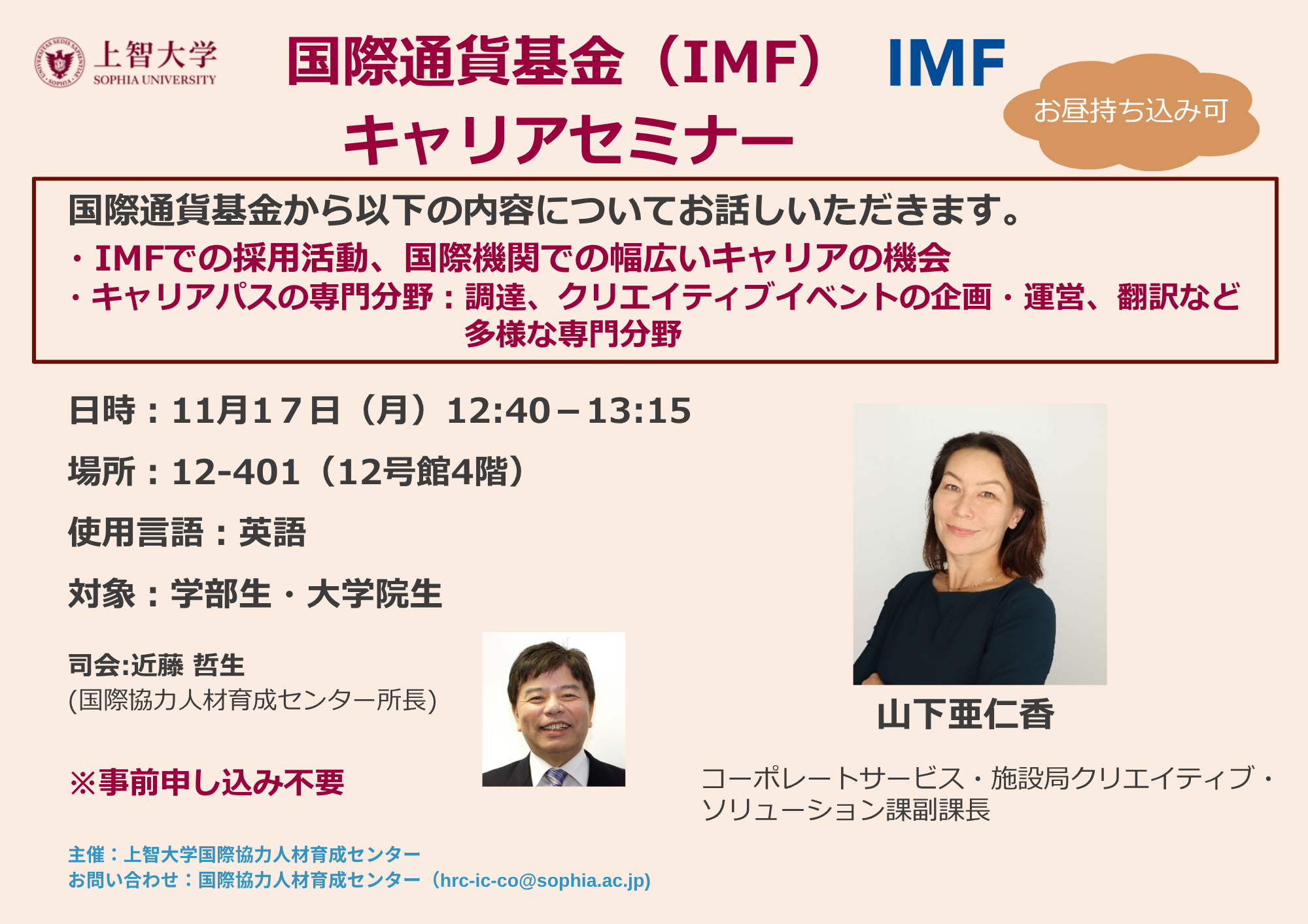 2025年11月17日(月)国際通貨基金(IMF)のキャリアセミナーをお昼休みの時間に開催いたします。