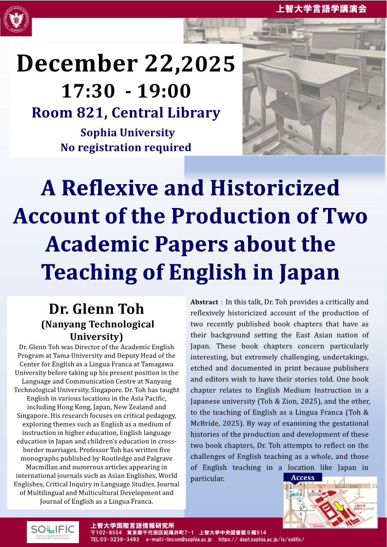 【Lecture】”A Reflexive and Historicized Account of the Production of Two Academic Papers about the Teaching of English in Japan” by Dr. Glenn Toh from Nanyang Technological University, Singapore