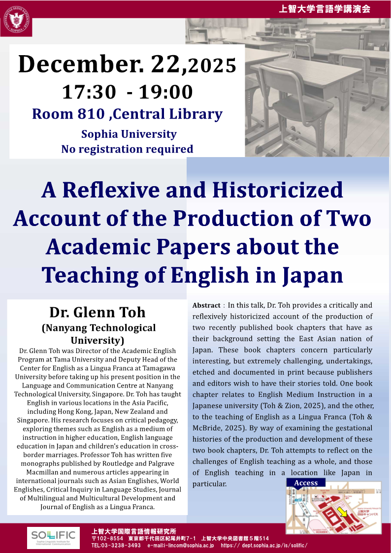 | 概要 | In this talk, Dr. Toh provides a critically and reflexively historicized account of the production of two recently published book chapters that have as their background setting the East Asian nation of Japan. These book chapters concern particularly interesting, but extremely challenging, undertakings, etched and documented in print because publishers and editors wish to have their stories told. One book chapter relates to English Medium Instruction in a Japanese university (Toh & Zion, 2025), and the other, to the teaching of English as a Lingua Franca (Toh & McBride, 2025). By way of examining the gestational histories of the production and development of these two book chapters, Dr. Toh attempts to reflect on the challenges of English teaching as a whole, and those of English teaching in a location like Japan in particular. |