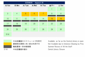 8月の国際言語情報研究所図書室(L513)のご利用について中央図書館のスケジュール